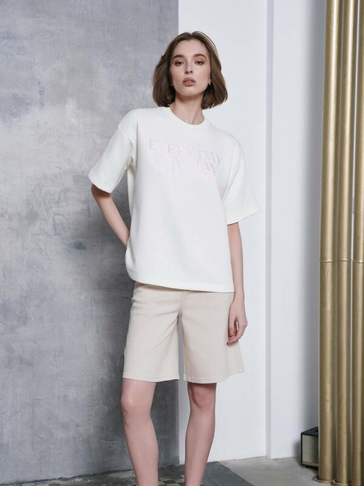 Свободная футболка из футера с вышивкой «Every day is a new chance» станет основой для множества расслабленных базовых образов.