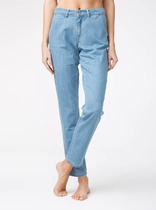 Джинсы с высокой посадкой из плотного, но эластичного денима красиво и комфортно садятся по фигуре, не добавляя силуэту ненужный объем. В процессе оксидной варки деним приобретает особый рисунок, что делает каждые джинсы уникальными.