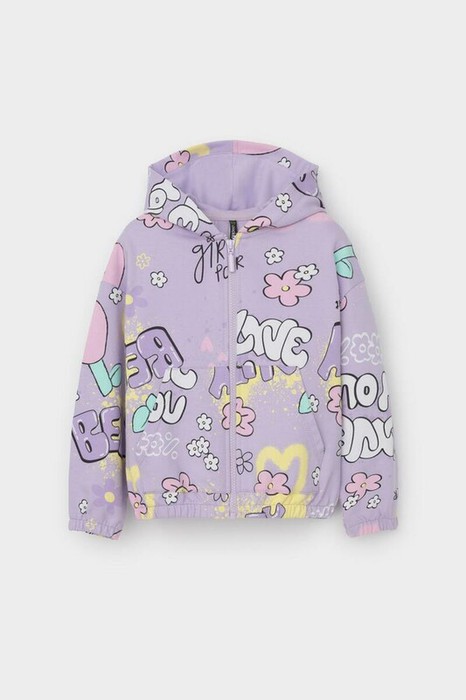 Трикотажная толстовка с капюшоном для девочки из мягкого набивного футера петли. Модель застёгивается на молнию, спереди два кармана. Пояс и манжеты на резинке.