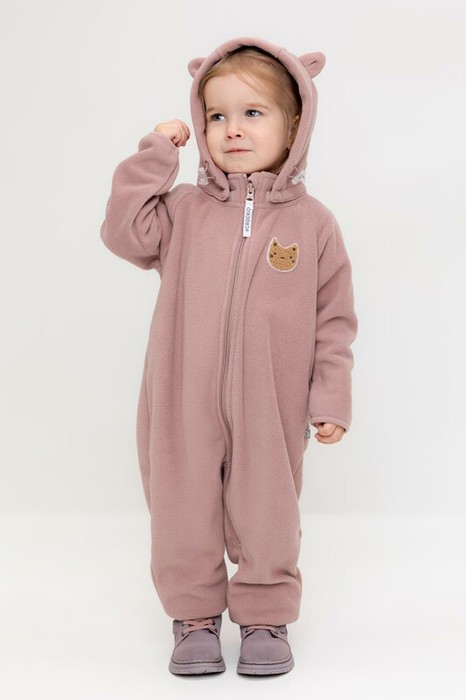 Флисовый комбинезон со съёмным капюшоном для девочки. У изделия высокий воротник и съёмный капюшон на кнопках. Застёгивается на удлинённую молнию. Предусмотрена защита шеи и подбородка. В размерах 40/62 - 48/74 на рукавах и штанинах есть удобные отвороты. Комбинезон сохраняет цвет и форму после многократных стирок.