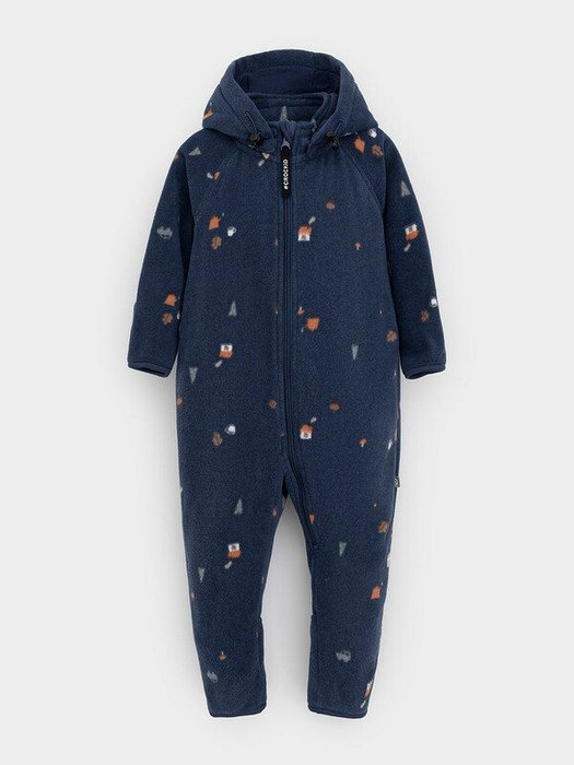 Флисовый комбинезон для мальчика со съёмным капюшоном. Капюшон регулируется по ширине с помощью эластичной утяжки со стопперами. Подклад выполнен из гладкого трикотажа супрем, произведённого из высококачественного натурального хлопка. Застёгивается на удлинённую молнию с мягкой защитой шеи и подбородка. В размерах 62, 68 и 74 на рукавах и ножках есть отвороты. Оригинальная набивка выполнена из стойких гипоаллергенных текстильных красителей. Комбинезон сохраняет цвет и форму после многократных стирок.