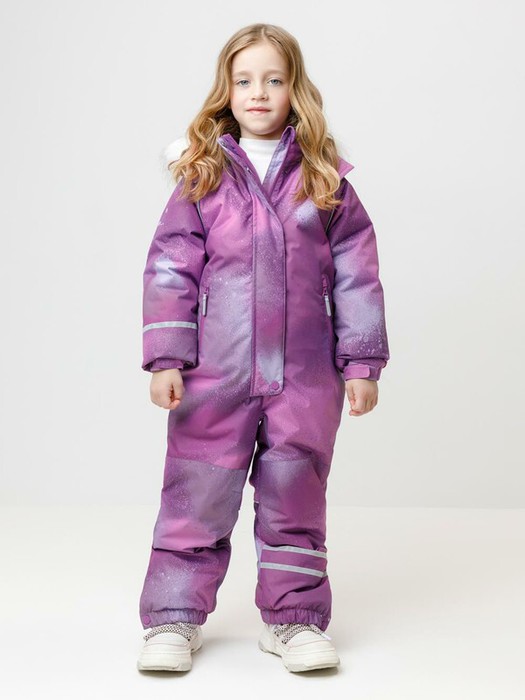 Зимний комбинезон для девочки с утеплителем Fellex®: 250 г/м2 . Выполнен из мембранной ткани с дополнительной тефлоновой обработкой, которая предохраняет изделие от загрязнений и отталкивает влагу. Подклад выполнен из 100% полиэстера Tricot. Комбинезон застёгивается на молнию и внешнюю планку на липучках и кнопках, предусмотрена защита подбородка. Съёмный капюшон имеет эластичную утяжку со стопперами и отстёгивающийся искусственный мех. Резинка по спинке обеспечивает лучшее прилегание. По бокам два кармана на молнии. Эластичные манжеты на рукавах  регулируются по ширине с помощью липучки, по низу изделия - с помощью кнопки. Внутренняя противоснежная юбка защищает обувь от попадания снега и удерживает комбинезон в закреплённом положении, предусмотрены отстёгивающиеся штрипки. Во всех изделиях верхнего ассортимента для безопасности ребёнка предусмотрены светоотражающие элементы.