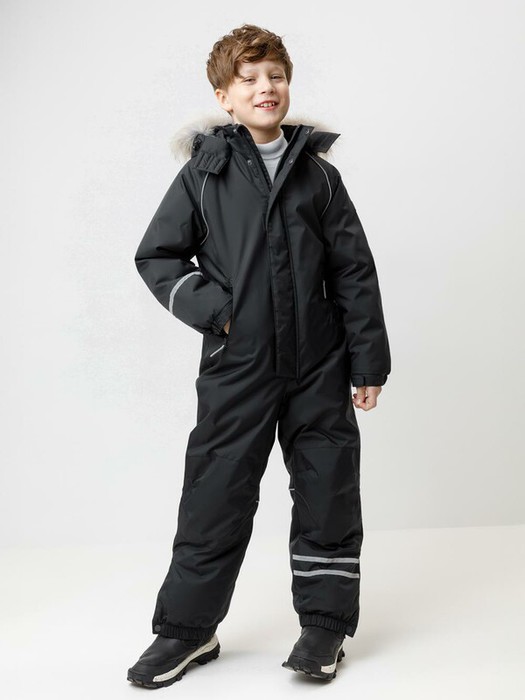 Зимний комбинезон для мальчика с утеплителем Fellex®: 250 г/м2 . Выполнен из мембранной ткани с дополнительной тефлоновой обработкой, которая предохраняет изделие от загрязнений и отталкивает влагу. Подклад выполнен из 100% полиэстера Tricot. Комбинезон застёгивается на молнию и внешнюю планку на липучках и кнопках, предусмотрена защита подбородка. Съёмный капюшон имеет эластичную утяжку со стопперами и отстёгивающийся мех на молнии. Резинка по спинке обеспечивает лучшее прилегание. По бокам два кармана на молнии. Эластичные манжеты на рукавах  регулируются по ширине с помощью липучки, по низу изделия - с помощью кнопки. Внутренняя противоснежная юбка  защищает обувь от попадания снега и удерживает комбинезон в закреплённом положении. В размерах с 98-104 по 116-122  предусмотрены отстёгивающиеся штрипки. Во всех изделиях верхнего ассортимента для безопасности ребёнка предусмотрены светоотражающие элементы.
