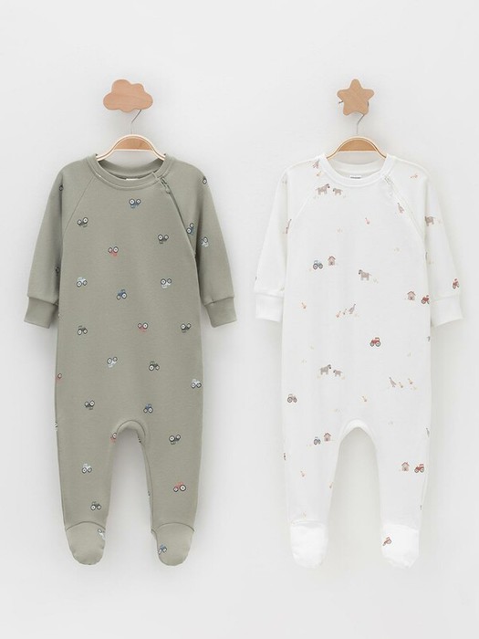 Комбинезоны для новорождённых из мягкого эластичного трикотажа интерлок, произведённого из натурального хлопка. В упаковке 2 штуки. Застёгиваются сбоку на молнию с мягкой защитой шеи и подбородка. Длинные рукава-реглан оканчиваются манжетами. Оригинальная набивка выполнена из стойких гипоаллергенных текстильных красителей. Все трикотажные полотна производятся в соответствии с нормами швейцарского сертификата ЭкоТекс.