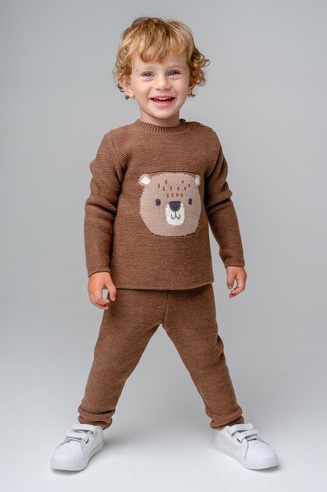 Теплый вязанный комплект из полушерстяной пряжи в состав которой входит шерсть австралийского мериноса. Связан двухизнаночной гладью. У изделия втачные рукава, связанные ластиком горловина и низ брюк. Для удобства джемпер застёгивается на плече на пуговицы.