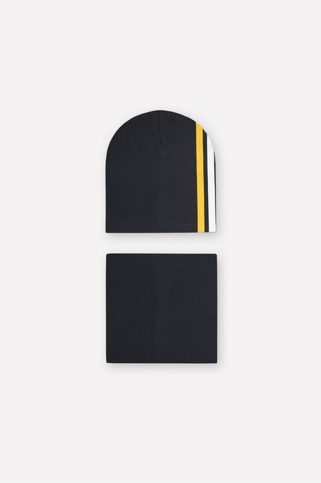 Комплект для мальчика - шапка и снуд из трикотажа рибана с эластаном. Шапка с удлинённой скругленной макушкой. Снуд сплошной. Украшены принтом со спортивными полосками.
