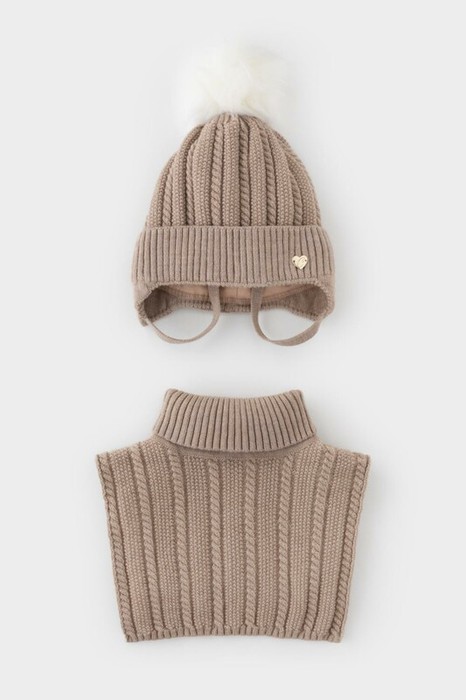 Комплект для девочки: шапка и манишка из полушерстяной пряжи. Шапка на завязках с синтепоновым утеплителем. Подклад из натурального хлопка. Полностью закрывает голову, уши и шею, защищая ребёнка от холодного воздуха и ветра. На макушке помпон. Манишка с высоким воротником с эластичным отворотом.