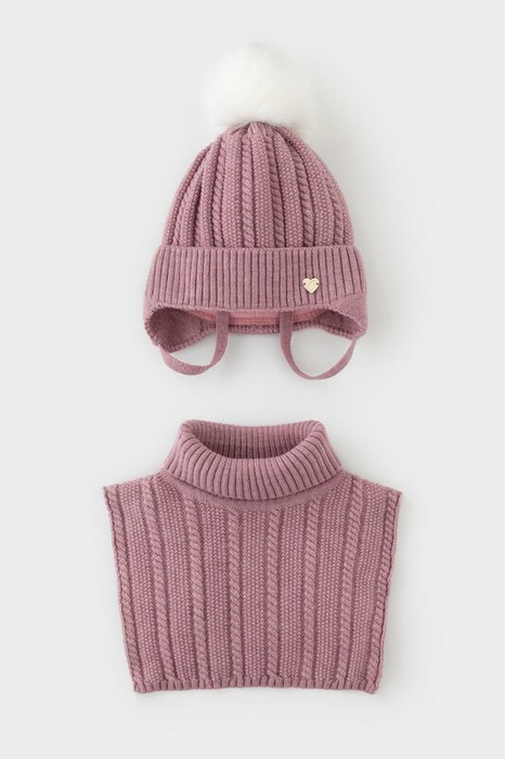 Комплект для девочки: шапка и манишка из полушерстяной пряжи. Шапка на завязках с синтепоновым утеплителем. Подклад из натурального хлопка. Полностью закрывает голову, уши и шею, защищая ребёнка от холодного воздуха и ветра. На макушке помпон. Манишка с высоким воротником с эластичным отворотом.