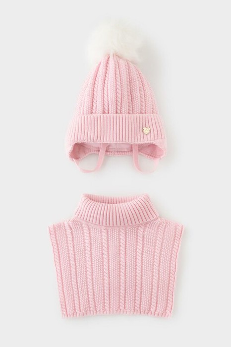 Комплект для девочки: шапка и манишка из полушерстяной пряжи. Шапка на завязках с синтепоновым утеплителем. Подклад из натурального хлопка. Полностью закрывает голову, уши и шею, защищая ребёнка от холодного воздуха и ветра. На макушке помпон. Манишка с высоким воротником с эластичным отворотом.