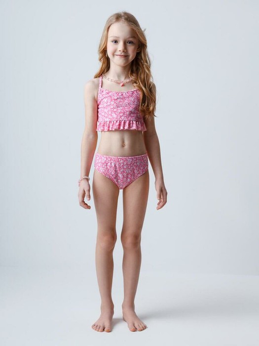 Раздельный купальник для девочки. Топ на регулируемых бретелях и плавки на эластичной резинке. Украшен оборками. Оригинальная набивка выполнена из стойких гипоаллергенных красителей.