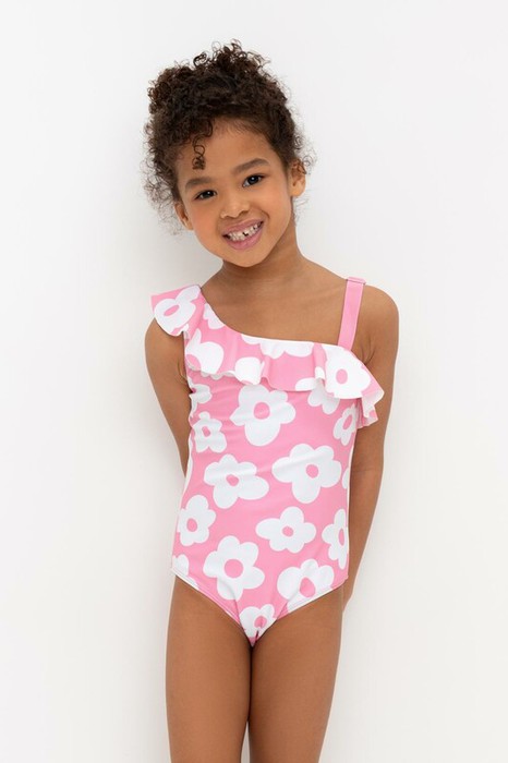 Слитный купальник на лямках для девочки. Украшен оборками. Оригинальная набивка выполнена из стойких гипоаллергенных красителей.