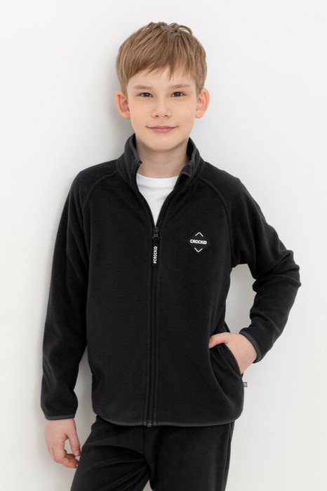 Флисовая куртка для мальчика. У изделия удлинённая спинка, высокий воротник, предусмотрена защита шеи и подбородка. Рукава-реглан и низ изделия обработаны эластичным кантом для лучшего прилегания к телу, по бокам два кармана. Куртка сохраняет цвет и форму после многократных стирок.