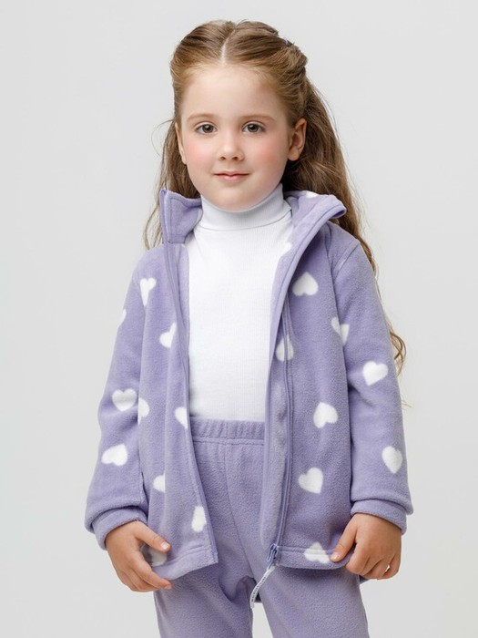 Флисовая куртка для девочки. У изделия высокий воротник и застёжка на молнию с мягкой защитой шеи и подбородка. По бокам два кармана. Оригинальная набивка выполнена из стойких гипоаллергенных текстильных красителей. Куртка сохраняет цвет и форму после многократных стирок.