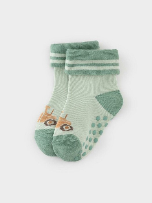 Носки детские с формованной пяткой и отворотом. Украшены рисунком. На стопе противоскользящие стопперы. Изделие сохраняет форму и стойкий цвет после многочисленных стирок.