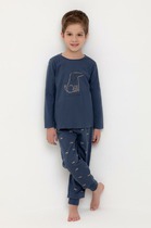 Трикотажная пижама из натурального хлопка. Джемпер с длинными втачными рукавами и брюки с эластичной резинкой в поясе. Мягкие манжеты по низу брюк. Оригинальные набивка и принт выполнены из стойких гипоаллергенных текстильных гипоаллергенных красителей. Изделие сохраняет цвет и форму после многократных стирок. Все трикотажные полотна производятся в соответсвии с нормами швейцарского сертификата ЭкоТекс.