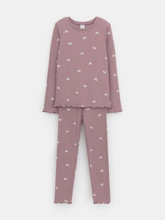 Трикотажная пижама в рубчик из натурального хлопка. Джемпер с длинными втачными рукавами и лосины с эластичной резинкой в поясе. Оригинальная набивка выполнена из стойких текстильных гипоаллергенных красителей. Изделие сохраняет цвет и форму после многократных стирок. Все трикотажные полотна производятся в соответствии с нормами швейцарского сертификата ЭкоТекс.