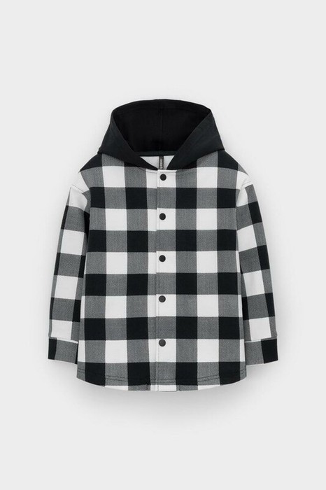 Свободная трикотажная рубашка для мальчика с капюшоном. Выполнена из мягкого петельчатого футера. Застёгивается на кнопки. Модель с закругленным низом и спущенным плечом. По бокам разрезы.
