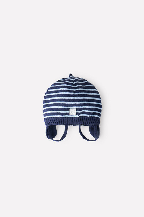 Шапка из хлопковой пряжи на завязках с мягким трикотажным подкладом из интерлока. На передней части шапочки пришит светоотражатель. Украшена вывязанным узором в полоску.