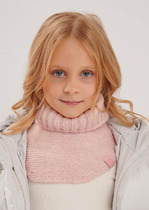 Однотонный снуд из полушерстяной пряжи для девочки, украшен вывязанными косами.