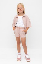 Трикотажные шорты для девочки из петельчатого футера с эффектом слаб. Эластичный пояс на резинке, по бокам два удобных кармана.