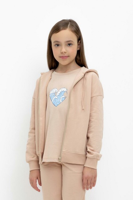 Трикотажная толстовка с капюшоном для девочки из петельчатого футера. Модель с карманами. Манжеты и пояс выполнены из эластичного трикотажа в рубчик.