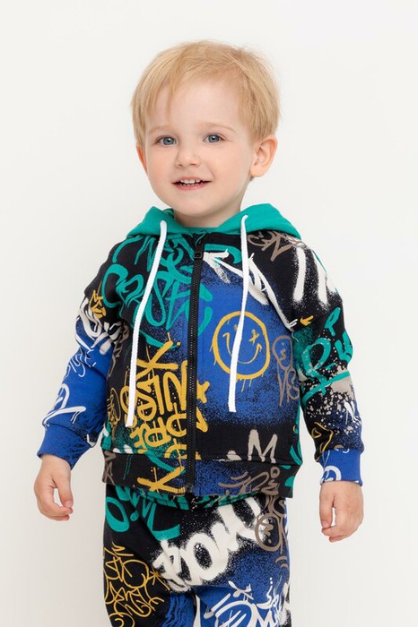 Трикотажная толстовка с капюшоном для мальчика из набивного футера с начесом. Модель с боковыми карманами. Манжеты и пояс из эластичного трикотажа в рубчик.