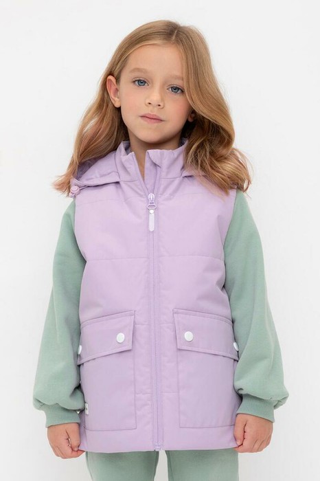 Стеганый жилет с капюшоном для девочки с утеплителем Fellex®: 120 г/м2. Выполнен из мембранной ткани с дополнительной тефлоновой обработкой. Данный вид обработки предохраняет изделие от загрязнения и лучше отводит влагу. Подклад из 100% полиэстра. У изделия предусмотрена защита подбородка. Капюшон утягивается при помощи эластичного шнура со стопперами. Накладные карманы с клапанами на кнопках. Во всех изделиях верхнего ассортимента для безопасности ребенка предусмотрены светоотражающие элементы.