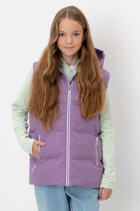 Стеганый жилет с капюшоном для девочки с утеплителем Fellex®: 120 г/м2. Выполнен из мембранной ткани с дополнительной тефлоновой обработкой. Данный вид обработки предохраняет изделие от загрязнения и лучше отводит влагу. Подклад из 100% полиэстра. Капюшон не снимается. Изделие застёгивается на молнию, предусмотрена защита подбородка. Два кармана по бокам застёгиваются на молнии. Во всех изделиях верхнего ассортимента для безопасности ребенка предусмотрены светоотражающие элементы.Жилет с капюшоном для девочки