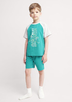 Трикотажный пижамный комплект из натурального хлопка. У футболки короткие рукава со спущенными плечами. Шорты с поясом на резинке. Оригинальная набивка выполнена из стойких, гипоаллергенных текстильных красителей. Все трикотажные полотна производятся в соответствии с нормами Швейцарского сертификата ЭкоТекс.
