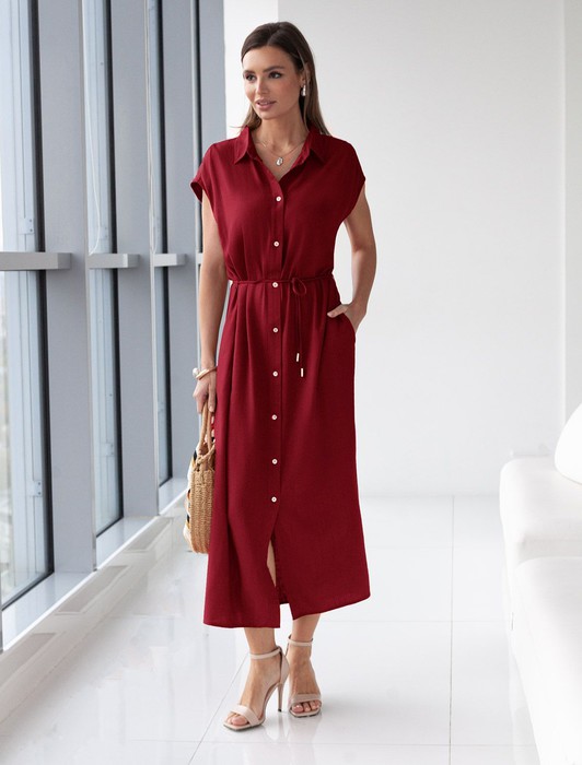 Состав: 70%Вис 30%Лен Плотность: 200 Г/м2Платье-рубашка гранатового цвета выполнено из натурального льна и вискозы, плотностью 200 Г/м2. Сочетание льна и вискозы обеспечивает комфорт и прохладу в жаркие дни. Это свободное платье на пуговицах по всей длине будет идеальным выбором для лета и весны. Благодаря качественному составу ткани, платье отлично держит форму, не сковывает движения и отличается износостойкостью. Отложной воротник добавляет классический акцент, удобный пояс подчеркивает талию, делая силуэт выразительным и женственным. Платье с коротким цельнокроеным рукавом смотрится современно, а высокие разрезы по бокам добавляют легкости и динамики образу. Подойдет на большие размеры, скроет возможные недостатки и подчеркнет достоинства фигуры. На высокий рост платье будет длины миди, а на низкий рост - длина макси. Такое красивое и легкое платье подойдет для работы, городской прогулки и повседневного стиля.