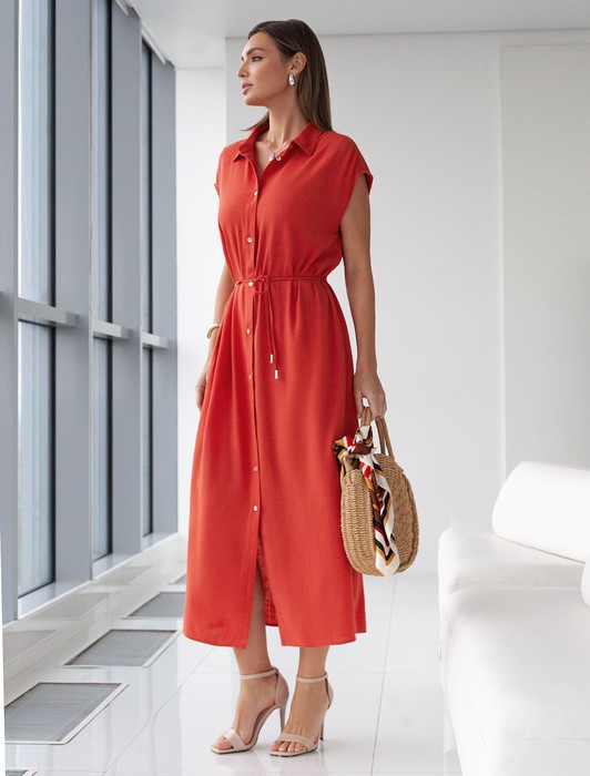 Состав: 70%Вис 30%Лен Плотность: 200 Г/м2Платье-рубашка кораллового цвета выполнено из натурального льна и вискозы, плотностью 200 Г/м2. Сочетание льна и вискозы обеспечивает комфорт и прохладу в жаркие дни. Это свободное платье на пуговицах по всей длине будет идеальным выбором для лета и весны. Благодаря качественному составу ткани, платье отлично держит форму, не сковывает движения и отличается износостойкостью. Отложной воротник добавляет классический акцент, удобный пояс подчеркивает талию, делая силуэт выразительным и женственным. Платье с коротким цельнокроеным рукавом смотрится современно, а высокие разрезы по бокам добавляют легкости и динамики образу. Подойдет на большие размеры, скроет возможные недостатки и подчеркнет достоинства фигуры. На высокий рост платье будет длины миди, а на низкий рост - длина макси. Такое красивое и легкое платье подойдет для работы, городской прогулки и повседневного стиля.