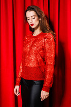 Джемпер удлинённый трикотажный вязанный с длинным рукавом-реглан. По переу нашивка «LOVE». Внизу по боковым швам разрезы. Горловина - стойка с отворотам, по краю которого нашивка «BUTER».