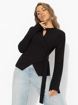 Джемпер трикотажный прямого силуэта со спущенной линией плеча и длинным рукавом. По переду отрезной бочек, в шов которого вставлен фастекс, благодаря чему у джемпера меняется силуэт и образуются дополнительные драпировки. По горловине притачная планка из основной ткани.
