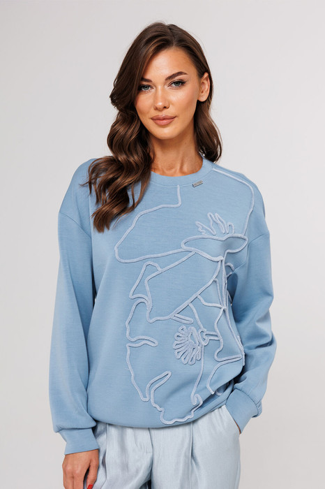 Джемпер из технологичного трикотажного полотна с эффектом peach. Прямого силуэта с втачным рукавом и спущенной линией плеча, с манжетой из основной ткани по низу рукава. По переду вышивка декоративным шнуром "FLOWERS" и нашивка "BUTER". По горловине и низу изделия притачная планка из основной ткани.