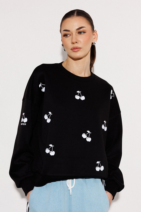 Джемпер из технологичного трикотажного полотна с эффектом peach. Прямого силуэта с втачным рукавом и спущенной линией плеча, с манжетой из отделочной ткани по низу рукава. По переду и на рукаве печать "CHERRY". По горловине и низу изделия притачная планка из отделочной ткани.