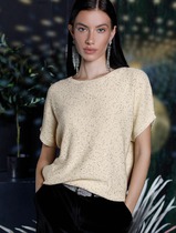 Джемпер выполнен из трикотажного полотна с рисунком. Джемпер прямого силуэта, длиной до линии бедра. Перед и спинка цельные. Горловина округлой формы, обработана широкой бейкой. Плечевой шов удлинен. Рукав одношовный, прямой.