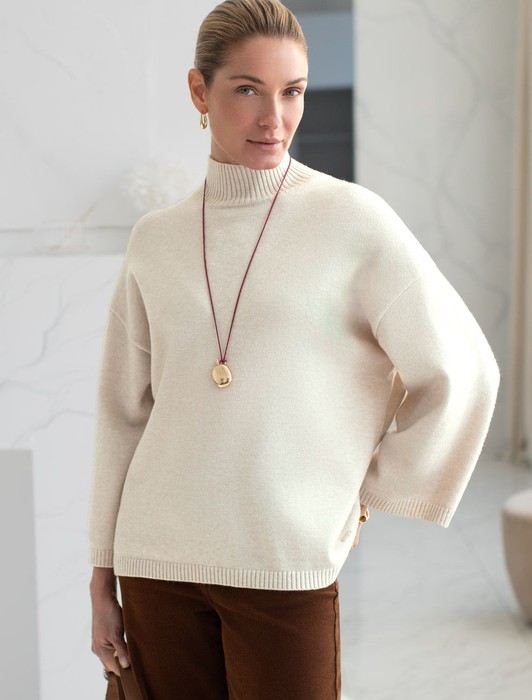 Состав: 52%ПАН (акрил) 33%ПЭ 8%ПУ 7%Кашемир Плотность: 9 GG Размер товара на первом фото: 42Джемпер выполнен из мягкой пряжи с кашемиром. Фишкой изделия являются свободные рукава на одном уровне с низом, это выгодно подчёркивает силуэт визуально вытягивая его. Мягкая пряжа очень приятная к телу, поддержит комфорт на протяжении всего дня, при этом не перегревая. Сочетается в костюме с брюками D38.013, D38.012 и юбкой D36.016