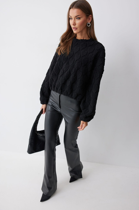 Укороченный джемпер прямого силуэта из трикотажного полотна. Горловина округлая. Рукав со спущенной линией плеча, по низу резинка. По низу джемпера резинка.