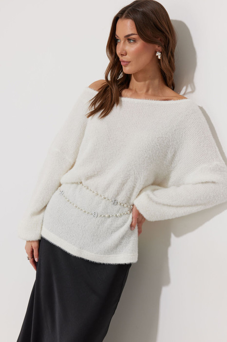 Джемпер  прямого силуэта из трикотажного полотна. Горловина-лодочка. Рукав со спущенной линией плеча длинный, по низу резинка.