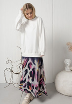 Джемпер свободного силуэта с округлой горловиной. Рукав комбинированного кроя, с передними и задними швами. Верхняя и нижняя часть рукава образуют между собой разрез. Карманы в боковых швах. По переду изделие декорировано фигурным бантом.