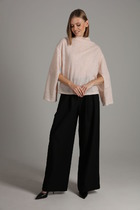 Джемпер прямого свободного силуэта. Горловина с цельнокроеным воротником-стойкой. Рукав втачной широкий, три четверти. В комплект входит съёмная авторская брошь-цветок ручной работы.