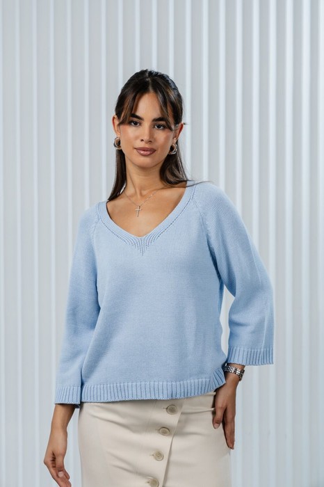 Джемпер прямого силуэта  связан из пряжи, в состав которой входит 50% хлопка,50% ПАН. Джемпер очень мягкий и приятный к телу, вывязан переплетением кулирная гладь. Рукав реглан прямой, длиной 7/8.V-образная горловина обработана цельновывязанной бейкой. Низ изделия, низ рукава  связаны переплетением ластик 2*2
