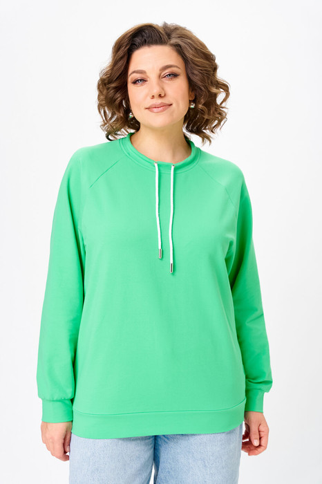 Джемпер женский из трикотажной хлопковой ткани (двунитка). Рукав реглан. Низ рукава обработан притачной манжетой. Низ изделия оформлен притачным поясом. На спинке настрочен декоративный элемент. Вырез горловины круглый, обработан бейкой со шнуром.