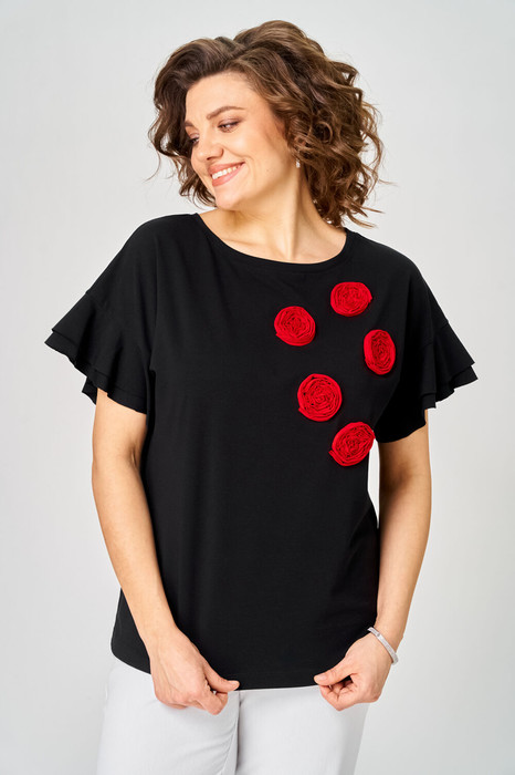Джемпер женский из трикотажной ткани, полуприлегающего силуэта. По переду джемпера расположены декоративные элементы. Вырез горловины круглый, оформлен бейкой. Пройма рукава оформлена воланами.