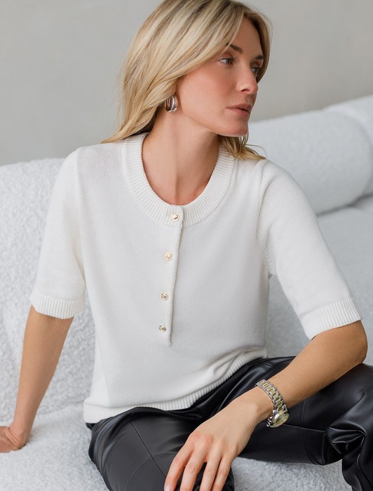 Состав: 70%Хлопок 21%ПА 9%Кашемир Плотность: 12 GG Размер товара на первом фото: 42Джемпер тонкой вязки выполнен из хлопка с добавлением кашемира. Модель с круглым вырезом дополнена золотистыми пуговицами. Мягкая и очень приятная пряжа совершенно не колется, сохраняет тепло при этом не перегревая, гарантируя безупречный комфорт.