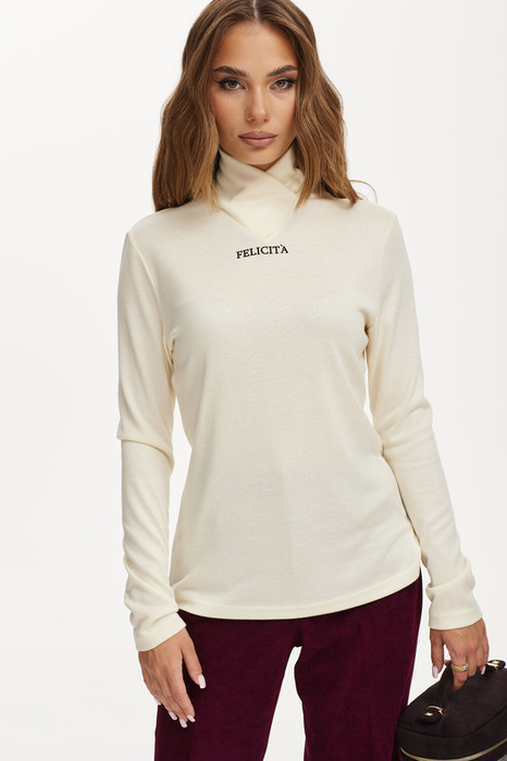 Джемпер облегающий из трикотажного полотна. Воротник высокая стойка. Рукав узкий, длинный. На переде печать.