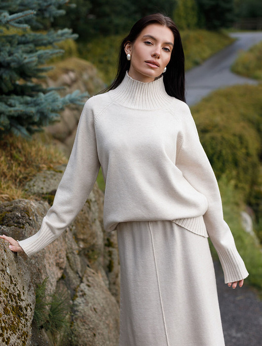 Джемпер с воротом стойка выполнен из мягкой пряжи с кашемиром. Модель свободного силуэта с рукавом реглан будет стильно сочетается с брюками и джинсами. Мягкая пряжа очень приятная к телу, поддержит комфорт на протяжении всего дня, при этом не перегревая. Сочетается в костюме с брюками D38.013, D38.012 и юбкой D36.016
