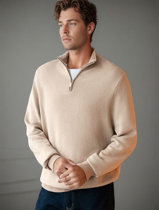 Состав: 55%Хлопок 45%ПАН (акрил) Параметры модели на первом фото: Рост 190, бюст 108, талия 87, бедра 104Бежевый джемпер с длинными рукавами выполнен из мягкой хлопковой пряжи с добавлением акрила. Высокий воротник застегивается молнией. За счет переплетения светлых и темных нитей получилась фактурная меланжевая модель, которая, отлично держит тепло и почти не ощущается на теле. Сочетается с футболками, денимом и с чиносами, любой обувью.