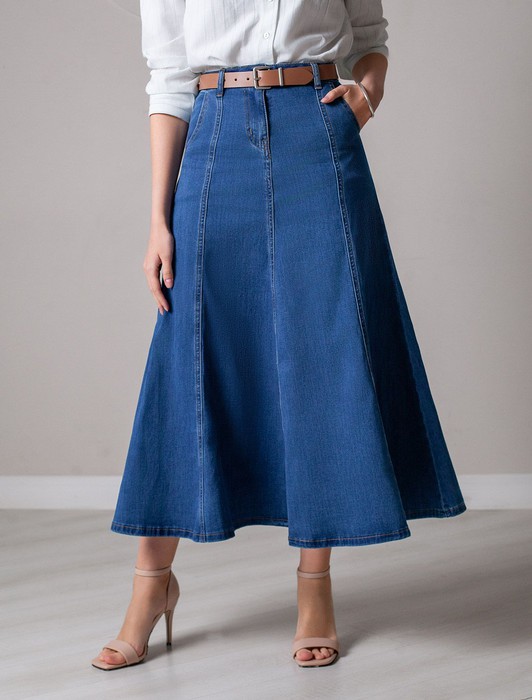 Совместные покупки Курган Женская одежда Футболки — Джинсовая юбка миди А силуэта с декоративными швами из эластичного денима
