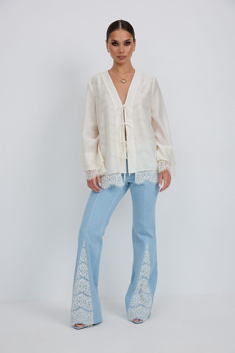 Брюки из джинса, прилегающего силуэта, слегка расклешенные к низу. Средняя посадка, пояс притачной, застежка спереди на молнию и пуговицу. По переду боковые карманы, вертикальные швы заканчиваются вставкой из кружева, сзади под кокеткой накладные карманы с кружевной отделкой.